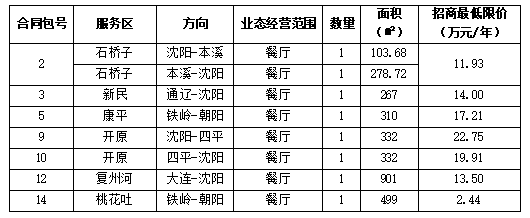 2.2招商范圍及合同包劃分:本次招商業(yè)態(tài)為石橋子、那四、開(kāi)原服務(wù)區(qū)雙側(cè)餐廳共計(jì)6個(gè);高花(沈陽(yáng)—北京方向)餐廳1個(gè)、新民(通遼—沈陽(yáng)方向)餐廳1個(gè)、康平(鐵嶺—朝陽(yáng)方向)餐廳1個(gè)、康平北(康平—沈陽(yáng)方向)餐廳1個(gè)、朝陽(yáng)(朝陽(yáng)—鐵嶺方向)餐廳1個(gè)、鐵嶺(四平—沈陽(yáng)方向)餐廳1個(gè)、復(fù)州河(大連-沈陽(yáng)方向)餐廳1個(gè),彰武(朝陽(yáng)-鐵嶺)餐廳1個(gè),桃花吐(鐵嶺-朝陽(yáng))餐廳1個(gè),本項(xiàng)目共劃分為14個(gè)合同包。